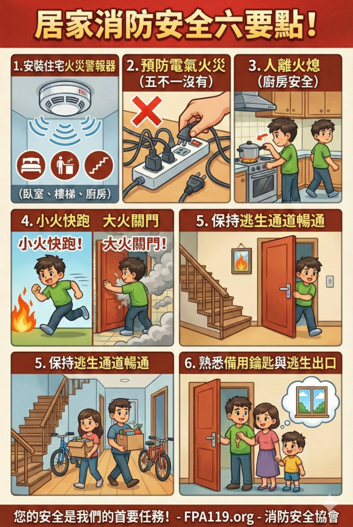 - 確保家中每個成員都知道備用鑰匙位置或第二逃生出口。